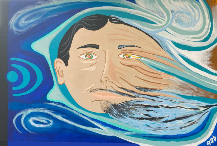 The painting uses acrylic on canvas, measuring 24″ x 36″. Pamela Fay Today has skillfully depicted the man’s face with surrealistic details, capturing the emotions and experiences etched into his features. The use of darkness cascading over his transitioning face represents the challenges and struggles we face in life.
