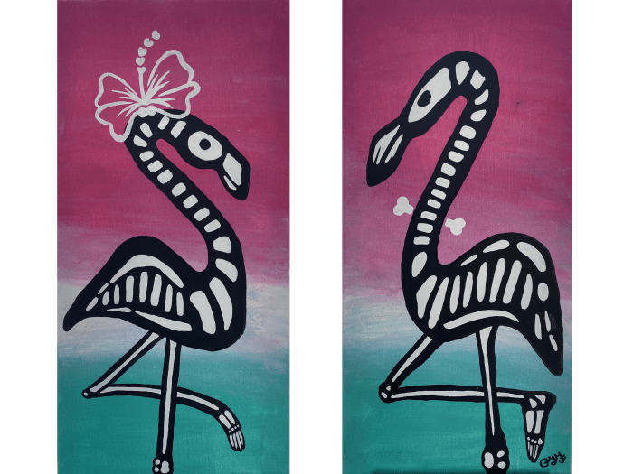 “Love Bones” is a stunning work of art that features two pop art style panels filled with the most unexpected subject matter: a pair of skeleton flamingos in love. Each panel portrait depicts the delicate and intricate details of the two birds, whose bones are visible and illuminated by a black silhouette. The background of each panel is a bright pink and teal, splashed with white, creating a truly striking contrast.